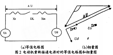 圖1所示為母線槽系統(tǒng)的某一段接線圖,圖2為電動(dòng)機(jī)切換時(shí)的等值電路圖。圖中Us-電源電壓;Ud-母線槽上電動(dòng)機(jī)的殘壓;Xs-電源等值電抗;Xm-母線槽上電動(dòng)機(jī)組和低壓負(fù)載的等值電抗(折算到高壓母線槽壓);AU-電源電壓與殘壓之間的差拍電壓。