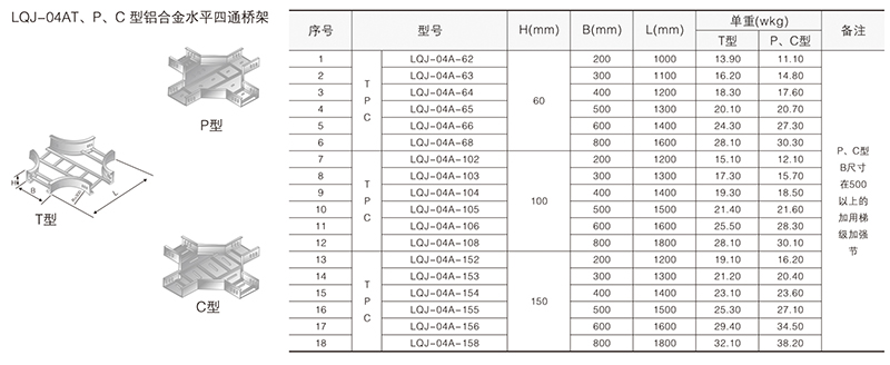 鋁合金電纜橋架在某種結構形式中無其它結構形式中的某-種產品類別,選型可作代用表示。例如:在LQU-CC型槽式鋁合金電纜橋架結構形式中,無鋁合金配線橋架中的LPC-03D, 即表示為LFC-CC-03D。