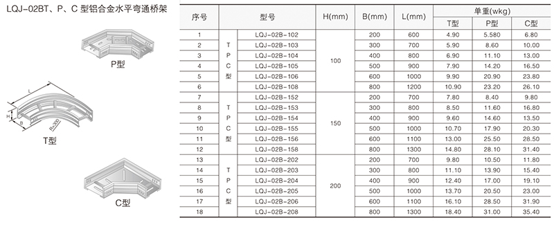 鋁合金電纜橋架在某種結構形式中無其它結構形式中的某-種產品類別,選型可作代用表示。例如:在LQU-CC型槽式鋁合金電纜橋架結構形式中,無鋁合金配線橋架中的LPC-03D, 即表示為LFC-CC-03D。